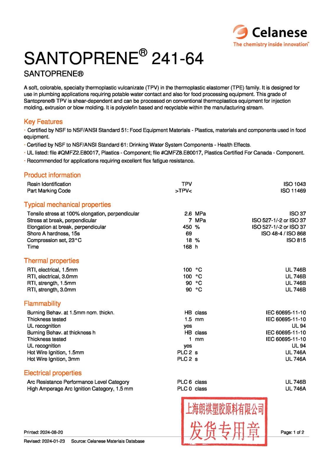 A soft, colorable, specialty thermoplastic vulcanizate (TPV) in the thermoplastic elastomer (TPE) family. It is designed for use in plumbing applications requiring potable water contact and also for food processing equipment. This grade of Santoprene?? TPV is shear-dependent and can be processed on conventional thermoplastics equipment for injection molding, extrusion or blow molding. It is polyolefin based and recyclable within the manufacturing stream.Key Features?·? Certified by NSF to NSF/ANSI Standard 51: Food Equipment Materials - Plastics, materials and components used in food equipment.?· Certified by NSF to NSF/ANSI Standard 61: Drinking Water System Components - Health Effects.?· UL listed: file #QMFZ2.E80017, Plastics - Component; file #QMFZ8.E80017, Plastics Certified For Canada - Component.?· Recommended for applications requiring excellent flex fatigue resistance.