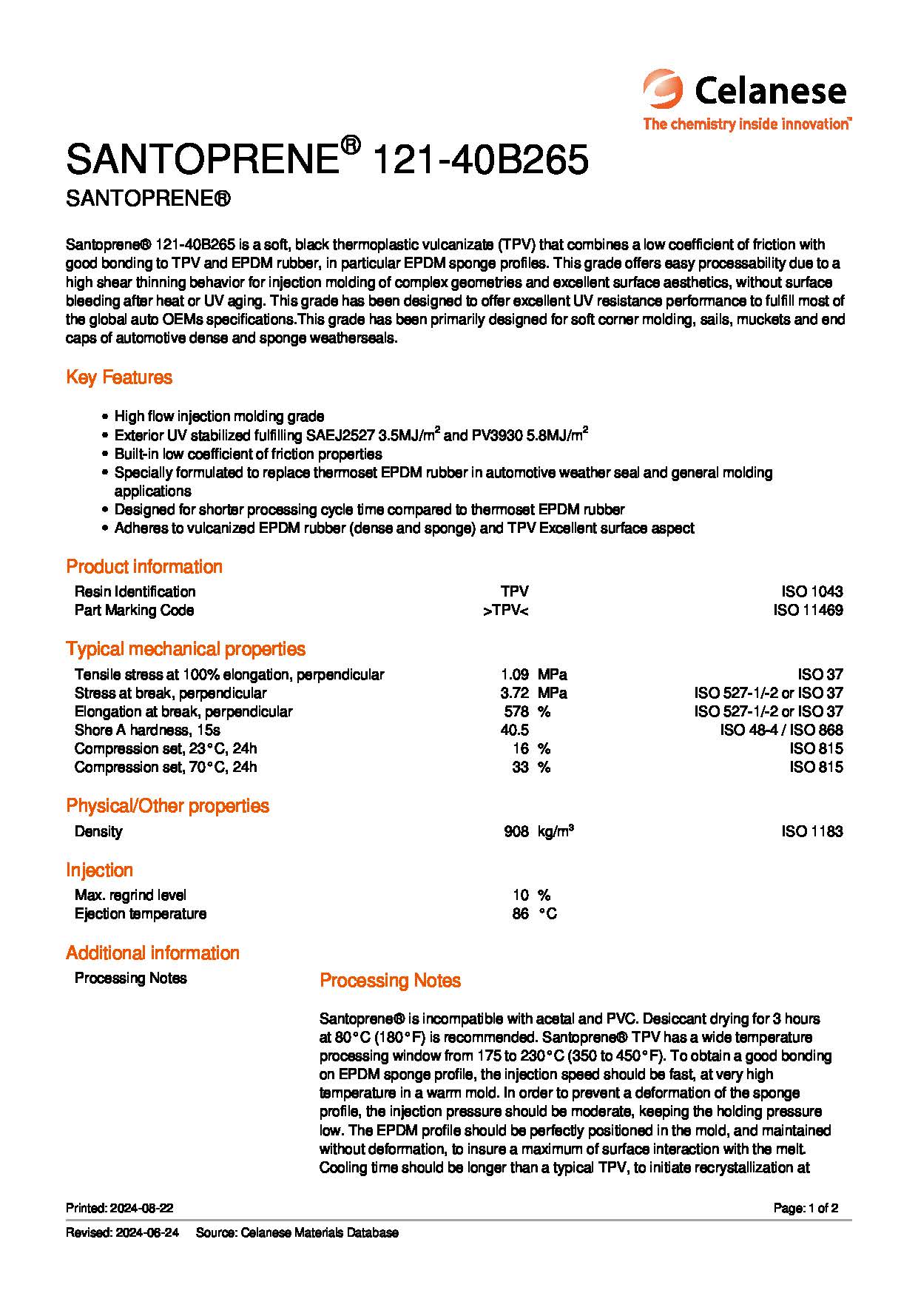 Santoprene? 121-40B265 is a soft, black thermoplastic vulcanizate (TPV) that combines a low coefficient of friction with good bonding to TPV and EPDM rubber, in particular EPDM sponge profiles. This grade offers easy processability due to a high shear thinning behavior for injection molding of complex geometries and excellent surface aesthetics, without surface bleeding after heat or UV aging. This grade has been designed to offer excellent UV resistance performance to fulfill most of the global auto OEMs specifications.This grade has been primarily designed for soft corner molding, sails, muckets and end caps of automotive dense and sponge weatherseals.Key Features High flow injection molding grade Exterior UV stabilized fulfilling SAEJ2527 3.5MJ/m2 and PV3930 5.8MJ/m2 Built-in low coefficient of friction properties Specially formulated to replace thermoset EPDM rubber in automotive weather seal and general molding applications Designed for shorter processing cycle time compared to thermoset EPDM rubber Adheres to vulcanized EPDM rubber (dense and sponge) and TPV Excellent surface aspect