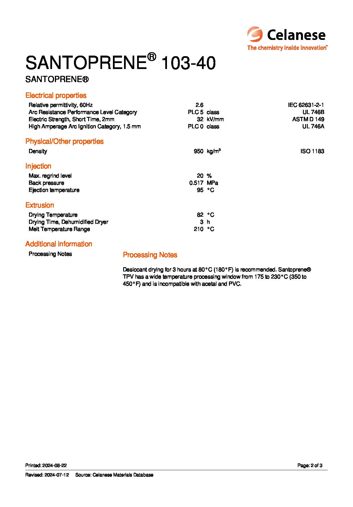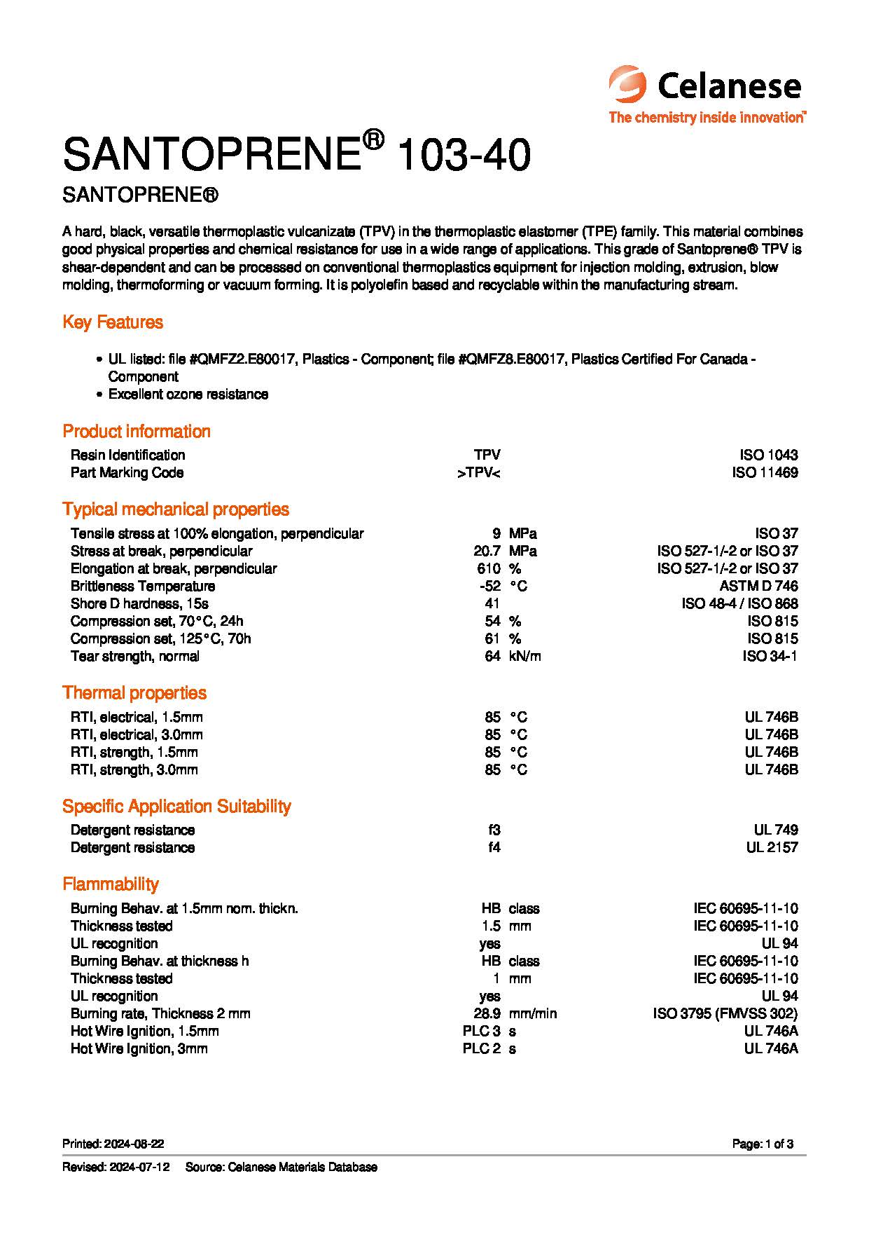 A hard, black, versatile thermoplastic vulcanizate (TPV) in the thermoplastic elastomer (TPE) family. This material combines good physical properties and chemical resistance for use in a wide range of applications. This grade of Santoprene? TPV is shear-dependent and can be processed on conventional thermoplastics equipment for injection molding, extrusion, blow molding, thermoforming or vacuum forming. It is polyolefin based and recyclable within the manufacturing stream.Key Features UL listed: file #QMFZ2.E80017, Plastics - Component; file #QMFZ8.E80017, Plastics Certified For Canada - Component Excellent ozone resistance