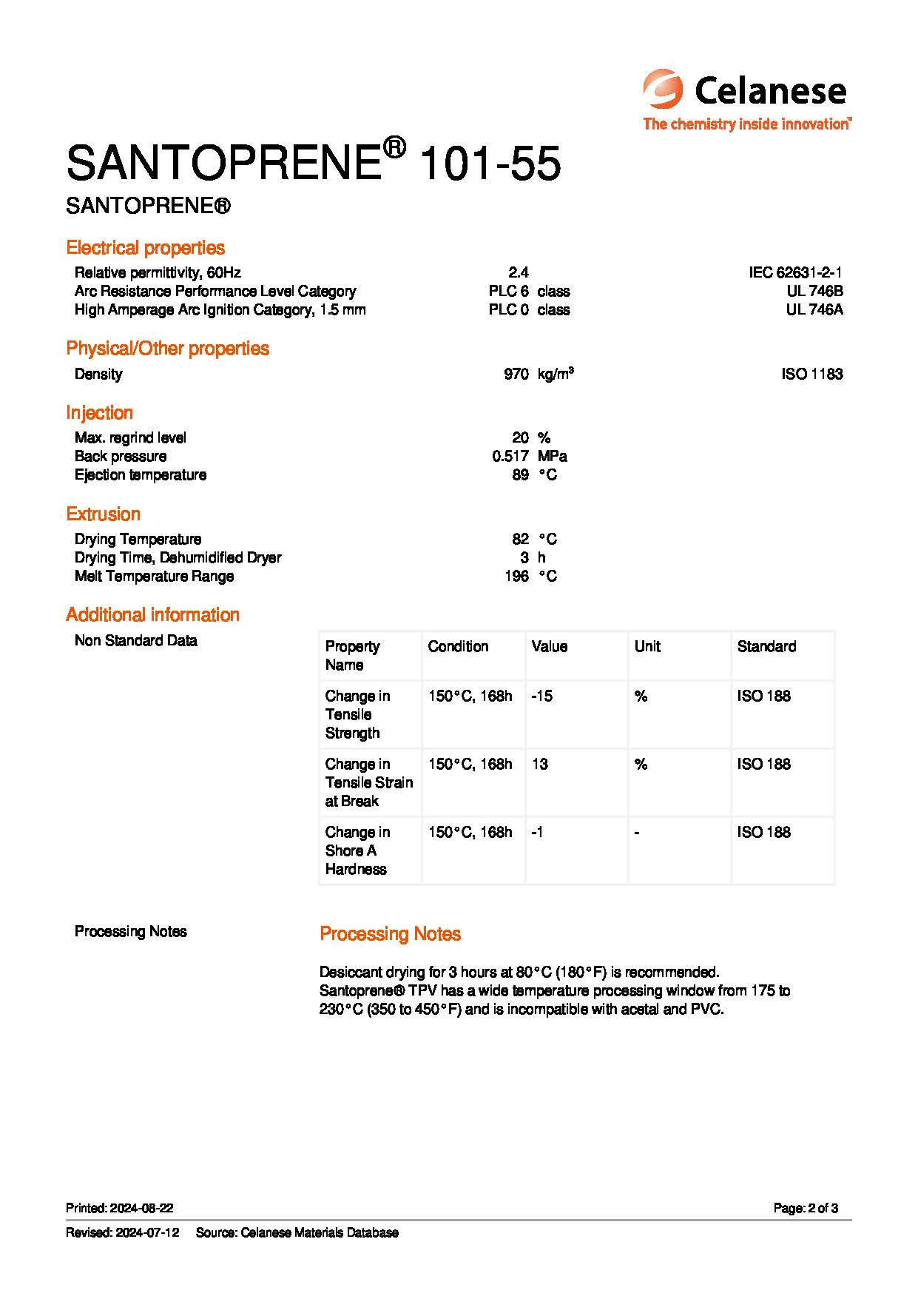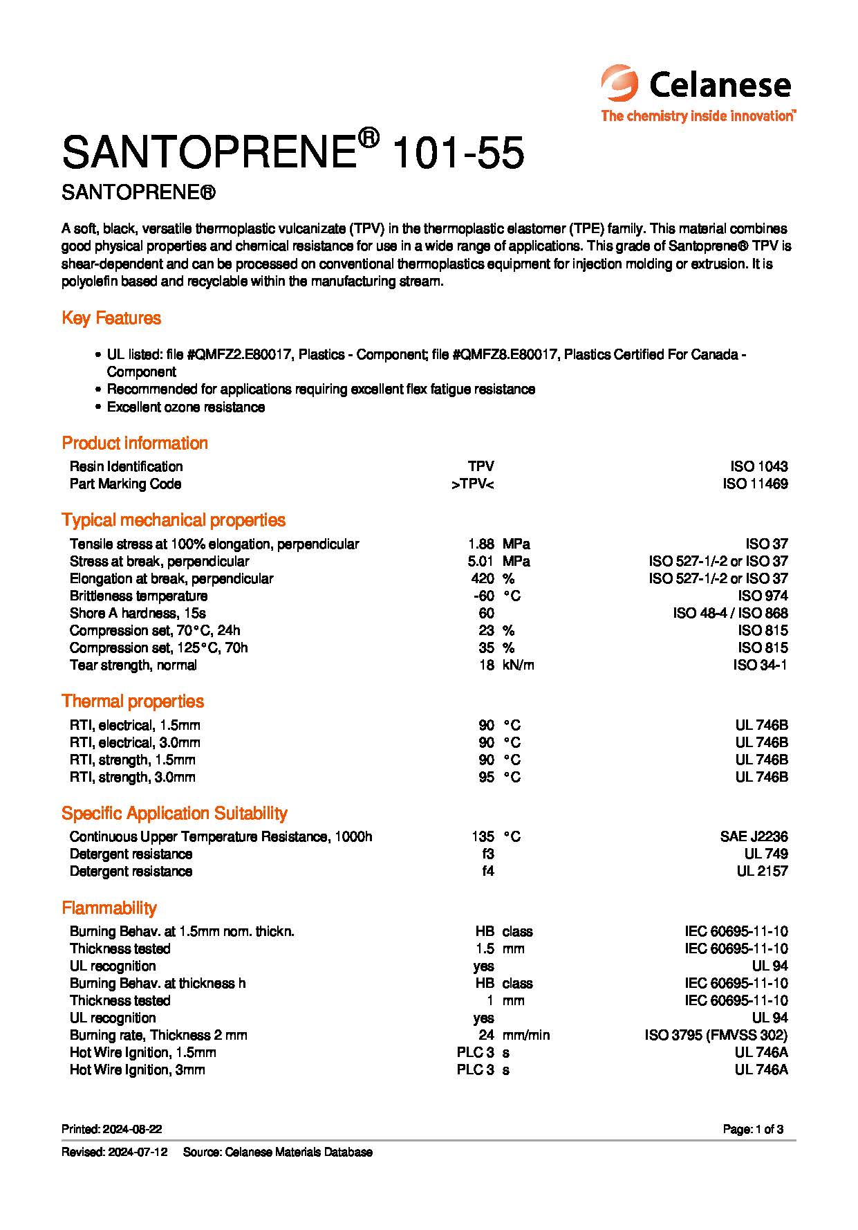 A soft, black, versatile thermoplastic vulcanizate (TPV) in the thermoplastic elastomer (TPE) family. This material combines good physical properties and chemical resistance for use in a wide range of applications. This grade of Santoprene? TPV is shear-dependent and can be processed on conventional thermoplastics equipment for injection molding or extrusion. It is polyolefin based and recyclable within the manufacturing stream.Key Features UL listed: file #QMFZ2.E80017, Plastics - Component; file #QMFZ8.E80017, Plastics Certified For Canada - Component Recommended for applications requiring excellent flex fatigue resistance Excellent ozone resistance