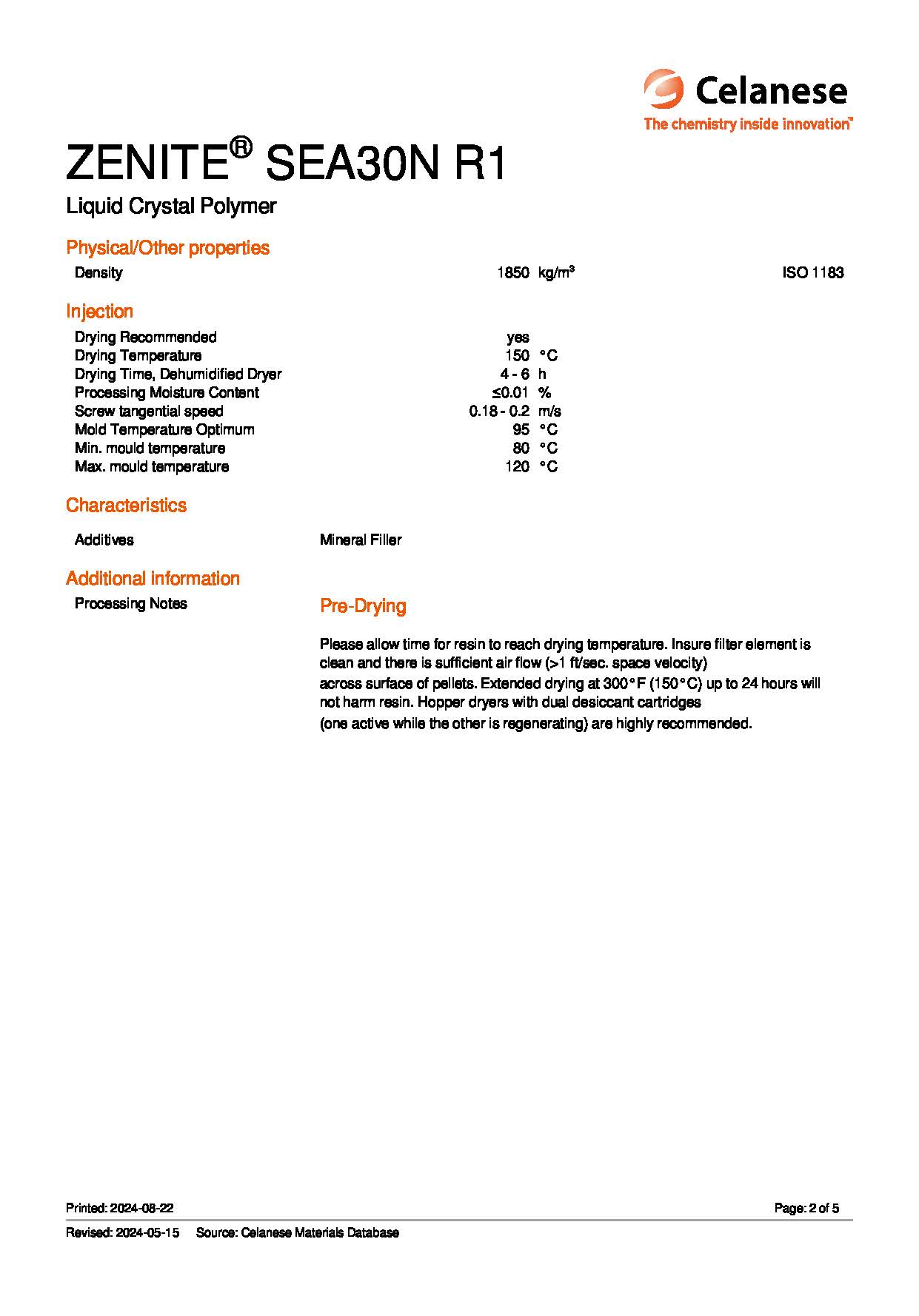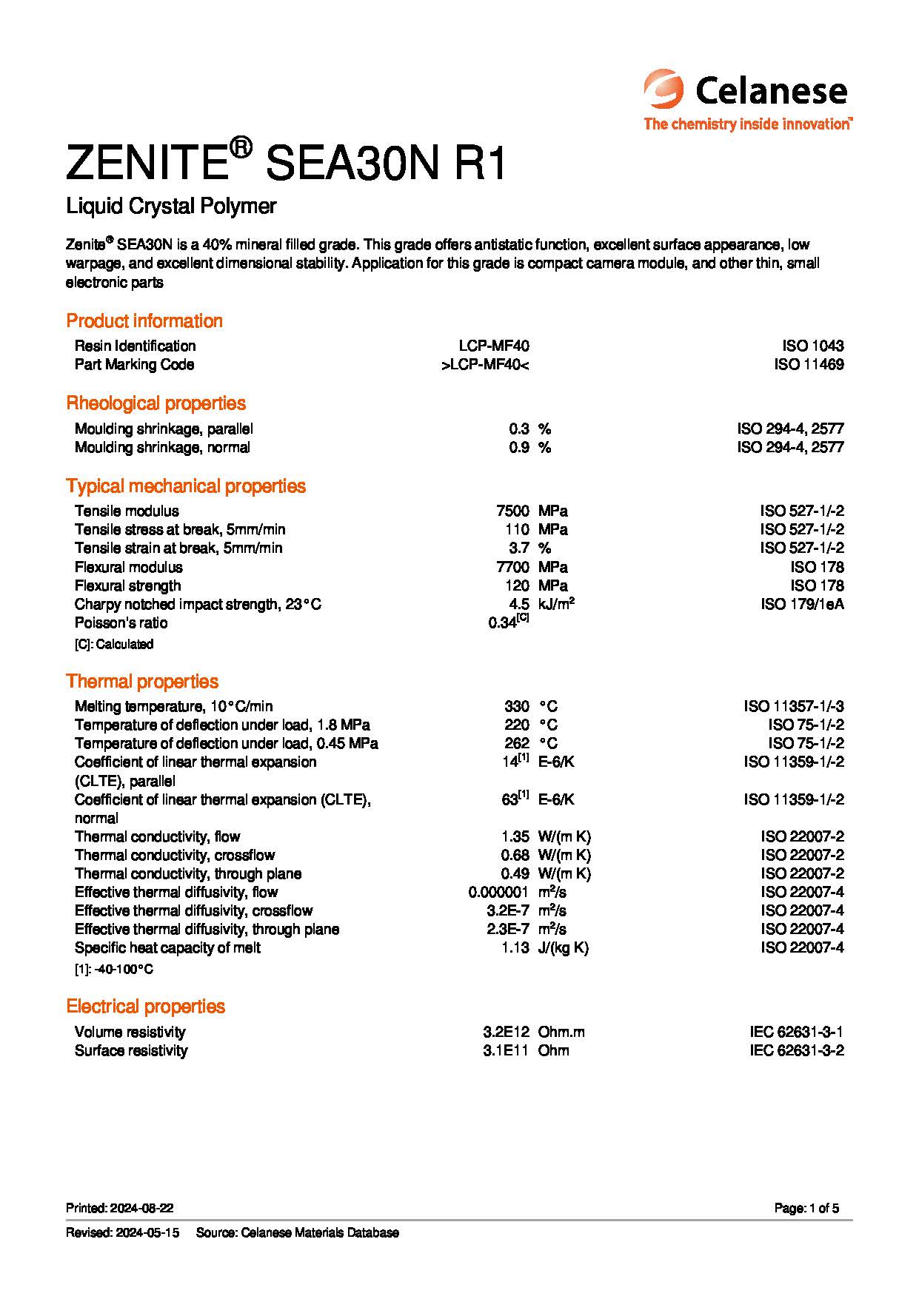 Zenite? SEA30N? is a 40% mineral filled grade. This grade offers antistatic function, excellent surface appearance, low warpage, and excellent dimensional stability. Application for this grade is compact camera module, and other thin, small electronic parts