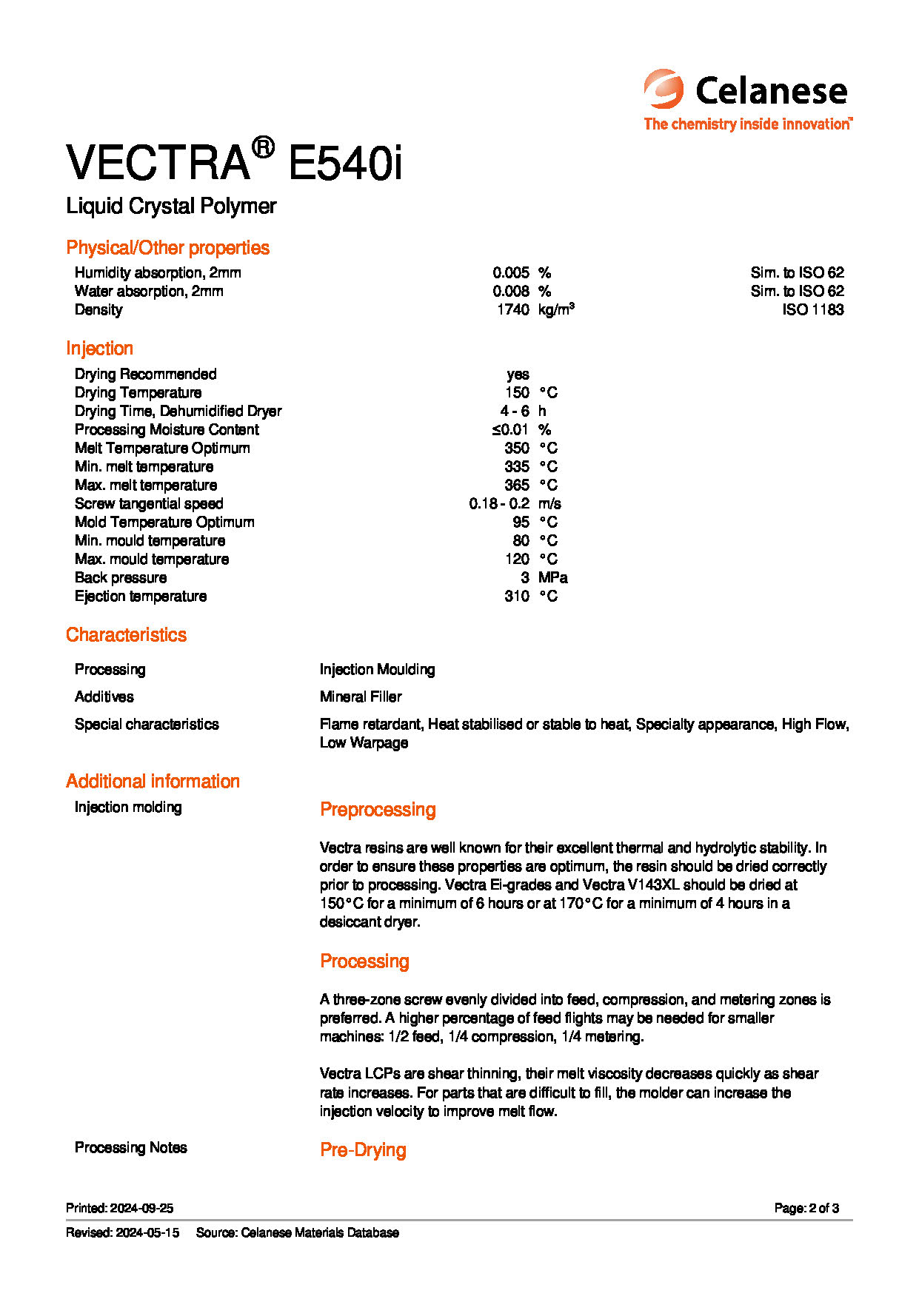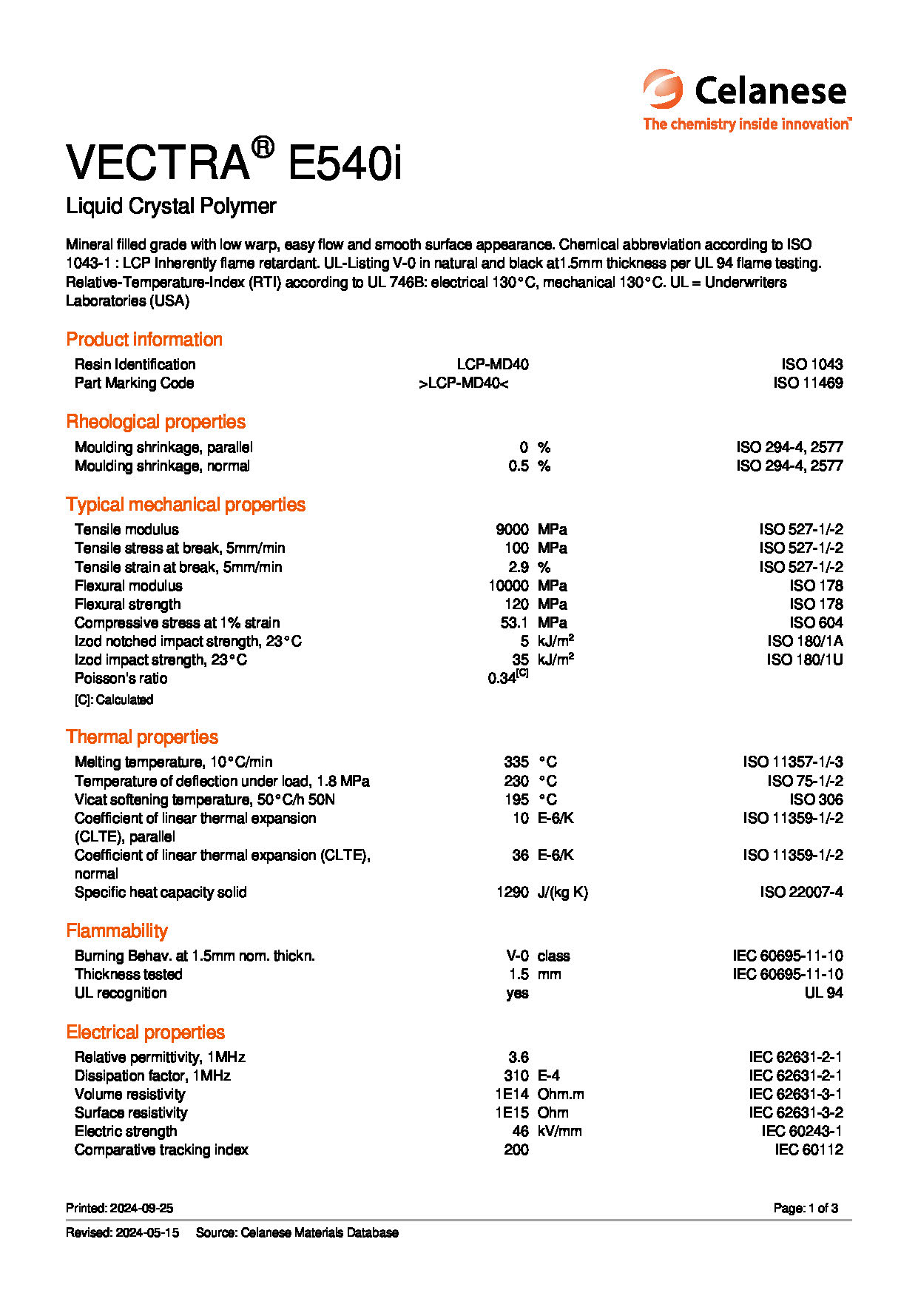 Mineral filled grade with low warp, easy flow and smooth surface appearance. Chemical abbreviation according to ISO 1043-1 : LCP Inherently flame retardant. UL-Listing V-0 in natural and black at1.5mm thickness per UL 94 flame testing. Relative-Temperature-Index (RTI) according to UL 746B: electrical 130°C, mechanical 130°C. UL = Underwriters Laboratories (USA)
